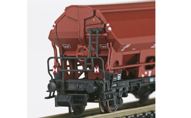 Das gilt zumindest für die Epoche III und IV, denn die meisten Güterwagen dieser Zeit waren braun lackiert. Der kleine Seitenentladewagen der Gattung Fcs 090 ist hervorragend detailliert und nun als 3er Set (Art. 15466) oder als Einzelwagen mit abweichender Betriebsnummer (Art. 18905) erhältlich. Diese Wagen wurden im Jahr 1961 erstmalig als Neuentwicklung gebaut. Insgesamt hat die Deutsche Bundesbahn mehr als 16.000 dieser Wagen im AW Kaiserslautern und Weiden bauen lassen. Anfangs als Otmm70 danach als Ed 090 bezeichnet, sind viele dieser Wagen heute noch (als Fcs 092) im Einsatz.