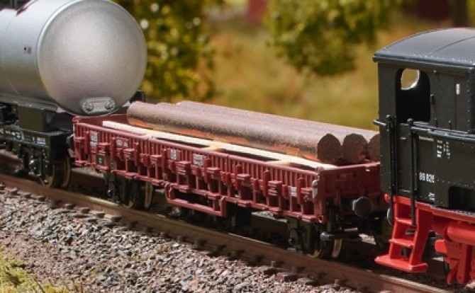 Das vierteilige Set enthält je einen Niederbordwagen Rmrso 31, einen zweiachsigen Kesselwagen, einen Silowagen Kds 56 der VTG und einen Seitenentladewagen Ktmmvs 69. Alle Wagen sind bei der Deutschen Bundesbahn eingestellt. Der Niederbordwagen ist mit Stahlstangen beladen. Der Selbst- oder Seitenentladewagen ist werkseitig mit fein bedruckten Schlussscheiben versehen.
