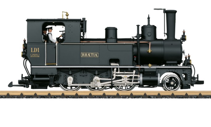 Modell der Lok LD1 "Rhätia" der Landquart-Davos-Bahn in komplett schwarzer Farbgebung. Die Lok bildet den Zustand nach, wie sie ab 2024 wieder in den Sonderzugbetrieb gehen soll. Dieser Zustand entspricht in etwa dem Ursprungszustand der Lok, wie sie 1889 als erste G 3/4 in Betrieb genommen wurde.